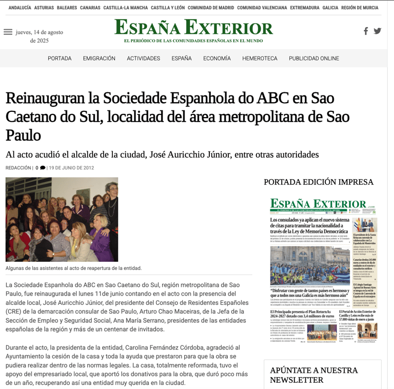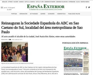A Sociedade Espanhola do ABC, localizada em São Caetano do Sul, na região metropolitana de São Paulo, foi reinaugurada na segunda-feira, 11 de junho, em um evento que contou com a presença do prefeito local, José Auricchio Júnior; do presidente do Conselho de Residentes Espanhóis (CRE) da demarcação consular de São Paulo, Arturo Chao Maceiras; da chefe da Seção de Emprego e Seguridade Social, Ana María Serrano; de presidentes de entidades espanholas da região e de mais de uma centena de convidados.